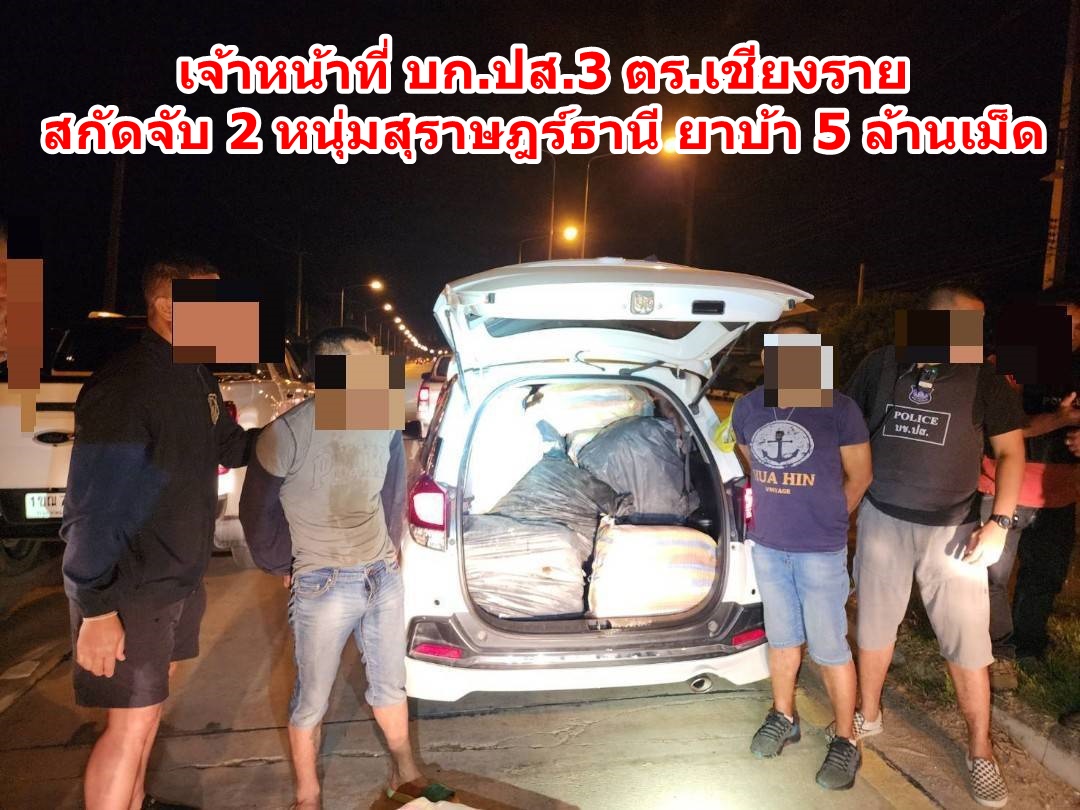 เจ้าหน้าที่ บก.ปส.3 ตร.เชียงราย สกัดจับ 2 หนุ่มสุราษฎร์ธานี ยาบ้า 5 ล้านเม็ด