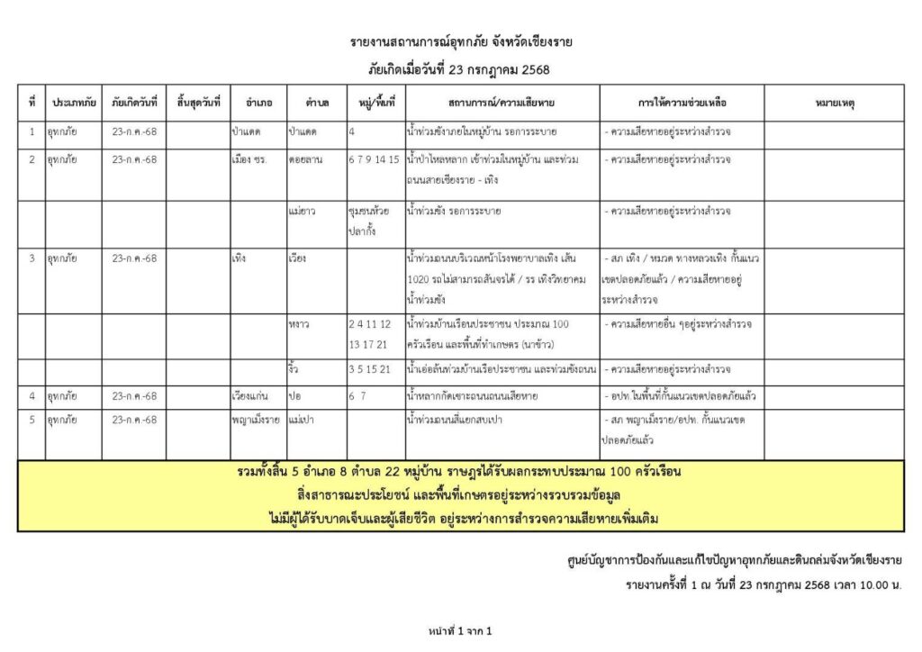 ซึ่งขณะนี้มีพื้นที่ได้รับผลกระทบความเสียหายจากอุทกภัยและดินถล่มแล้วรวม 5 อำเภอ 8 ตำบล 22 หมู่บ้าน มีประชาชนได้รับผลกระทบประมาณ 100 ครัวเรือน แม้จะยังไม่มีรายงานผู้บาดเจ็บหรือเสียชีวิต แต่ความเสียหายต่อสาธารณูปโภคและพื้นที่เกษตรกำลังอยู่ระหว่างการสำรวจและรวบรวมข้อมูลแนวโน้มและการเฝ้าระวังจังหวัดเชียงรายยังคงต้องเฝ้าระวังฝนที่อาจตกซ้ำและปริมาณน้ำที่อาจไหลสมทบลงมาจากภูเขาอย่างใกล้ชิด เนื่องจากยังคงมีกลุ่มฝนฟ้าคะนองกำลังอ่อนปกคลุมพื้นที่ กองอำนวยการป้องกันและบรรเทาสาธารณภัยจังหวัดเชียงรายได้สั่งการให้หน่วยงานที่เกี่ยวข้องเตรียมพร้อมทั้งเครื่องมืออุปกรณ์ เครื่องจักรกล และกำลังพล เพื่อให้ความช่วยเหลือประชาชนได้ทันทีตลอด 24 ชั่วโมง เมื่อได้รับการร้องขอประชาชนในพื้นที่เสี่ยงควรติดตามข่าวสารและประกาศเตือนจากทางการอย่างใกล้ชิด และเตรียมพร้อมรับมือกับสถานการณ์น้ำท่วมฉับพลันและดินถล่มที่อาจเกิดขึ้นได้ทุกเมื่อ
