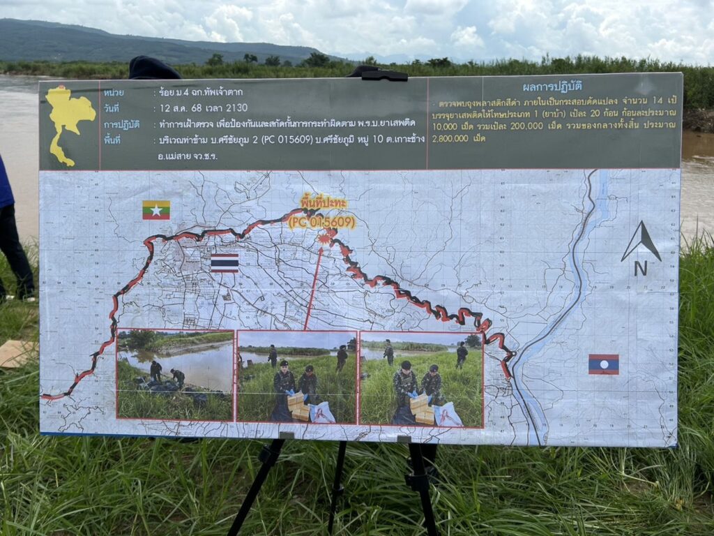 เมื่อกลางดึกของคืนวันที่ 12 ส.ค. 68 เวลา 21.30 น. เจ้าหน้าที่ทหาร ร้อย.ม.4 ฉก.ทัพเจ้าตาก กกล.ผาเมือง ออกปฏิบัติภารกิจเฝ้าตรวจตามเส้นทางยุทธศาสตร์ บริเวณท่าข้ามธรรมชาติ บ.ศรีชัยภูมิ พื้นที่ บ.ศรีชัยภูมิ ม.10 ต.เกาะช้าง อ.แม่สาย จ.เชียงราย หลังได้รับแจ้งจากแหล่งข่าวว่า จะมีการแอบลักลอบลำเลียงยาเสพติดเข้าสู่ฝั่งไทยบริเวณพื้นที่ท่าข้ามดังกล่าว ต่อมาได้ตรวจพบกลุ่มบุคคลต้องสงสัย จำนวน 2-4 คน พยายามลักลอบนำสิ่งของต้องสงสัยขนย้ายโดยเรือ จากฝั่งเมียนมาข้ามแม่น้ำรวกมายังฝั่งไทยบริเวณจุดเกิดเหตุ ทางเจ้าหน้าที่ทหารจึงได้แสดงตัวเพื่อขอทำการตรวจค้น แต่กลุ่มดังกล่าวได้ใช้อาวุธปืน (ไม่ทราบชนิด) ยิงเข้าใส่ จนท. จึงเกิดการปะทะกันขึ้นประมาณ 5 นาที ภายหลังเสียงปืนสงบลงจึงได้ประสานงานไปยัง สภ.เกาะช้าง ฝ่ายปกครองแม่สาย เพื่อเข้าทำการเข้าตรวจสอบอย่างละเอียดบริเวณพื้นที่ปะทะ สามารถตรวจยึดยาเสพติดให้โทษ ประเภท 1 (ยาบ้า) ประมาณ 2,800,000 เม็ด บรรจุอยู่ภายในกระสอบฟางดัดเเปลงเป็นเป้สะพาย จำนวน 14 เป้/กระสอบ (200,000 เม็ด สำหรับ ส่วนกลุ่มขบวนการค้ายาเสพติดได้หลบหนีข้ามแม่น้ำรวกกลับไปยังฝั่งเมียนมา เจ้าหน้าที่ชุดตรวจยึดจึงได้นำยาบ้าของกลางส่งพนักงานสอบสวน สภ.เกาะช้างเพื่อดำเนินคดีและขยายผลติดตามหากลุ่มเครือข่ายค้ายาเสพติดในพื้นที่ ต.เกาะช้าง ต่อไป…