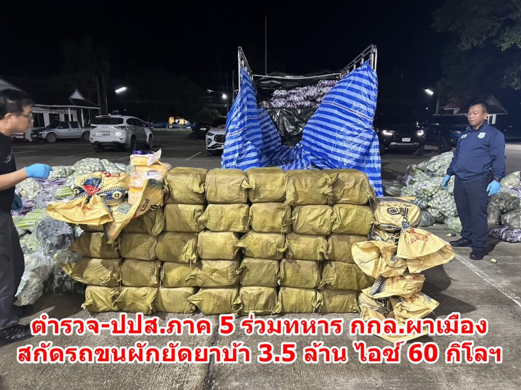 ตำรวจ-ปปส.ภาค 5 ร่วมทหาร กกล.ผาเมือง สกัดรถขนผักยัดยาบ้า 3.5 ล้าน ไอซ์ 60 กิโลฯ