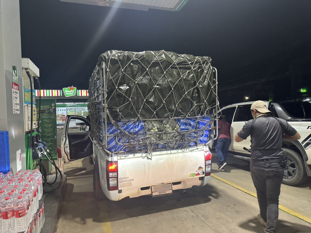 ต่อมา พล.ต.ต.มานพ เสนากุล ผบก.ภ.จว.เชียงราย ได้รับแจ้งว่าเจ้าหน้าที่ในท้องที่ได้ตรวจพบรถยนต์กระบะ ยี่ห้อ อีซูซุ สีขาว ป้ายทะเบียน จ.เชียงใหม่ ด้านหลังมีโครงเหล็กซึ่งบรรทุกพืชผักส่วนใหญ่เป็นผักกาดขาวและมะเขือเปราะมาเต็มลำ และมีรถยนต์นั่งส่วนบุคคล ยี่ห้ออีซูซุ รุ่นมิวเอ็กซ์ สีขาว ป้ายทะเบียนกรุงเทพฯ ขับนำทางไปตามทางหลวงหมายเลข 118 ผ่าน อ.เวียงเป่าเป้า จึงสั่งการให้เจ้าหน้าที่ตำรวจ สภ.เวียงป่าเป้า สกัดรถทั้ง 2 คันเอาไว้ โดยรถคันแรกสกัดไว้ได้ขณะเข้าไปเติมน้ำมันในปั๊มน้ำมันเชื้อเพลิง ต.เวียง อ.เวียงป่าเป้า พบมีนายใหญ่ อายุ 47 ปี ชาว ต.สันสลี อ.เวียงป่าเป้า เป็นคนขับมาคนเดียว ส่วนรถยนต์นั่งส่วนบุคคลที่ขับนำเจ้าหน้าที่ตำรวจตู้ยามป่างิ้ว ต.ป่างิ้ว อ.เวียงเป่าเป้า สกัดเอาไว้ได้ขณะจะผ่านหน้าตู้ยาม ภายในรถพบมีนายสะอาด อายุ 70 ปี ชาว ต.เวียง อ.เวียงป่าเป้า เป็นคนขับและมี น.ส.ธนฐิดา อายุ 38 ปี ชาว อ.เวียงป่าเป้า นั่งโดยสารไปด้วย