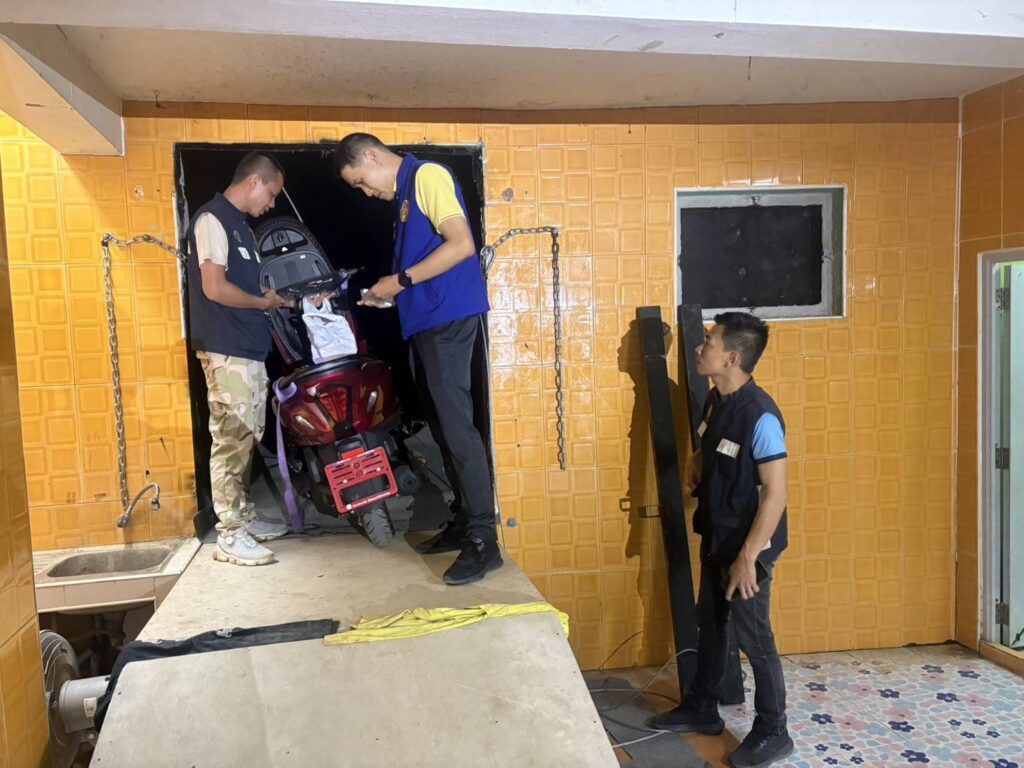 ทางเจ้าหน้าที่ได้สนธิกำลังเข้าตรวจค้นบ้านเลขที่ 646 (ข้างในมีบ้าน2ชั้นหลังใหญ่ และเป็นบ้านเช่าอีก3หลัง) บริเวณสุดซอย18 บ.เกาะทราย หมู่ 7 ต.แม่สาย อ.แม่สาย จ.เชียงราย หลังสืบทราบจากเจ้าหน้าที่การข่าวของทุกหน่วยงานตรงกันที่ได้ติดตามดูพฤติกรรมมาหลายวันแล้ว ว่ามีการลักลอบส่งออกรถจักรยานยนต์โดยผิดกฎหมาย (และติดตามเฝ้าดูขบวนการแอบลักลอบนำต่างด้าวข้ามแดน – สิ่งของผิดกฎมาย บริเวณท่าน้ำเถื่อนในซอย 16 ข้างวัด บ.เกาะทราย หลังจากการเข้าตรวจสอบภายในบ้านหลังใหญ่ชั้น1 พบรถจักรยานยนต์จอดอยู่จำนวน 10 คัน มีทั้งติดแผ่นป้ายทะเบียนไม่ติดแผ่นป้ายทะเบียนและมีเอกสารในการชื้อเป็นบ้างคัน จึงเก็บเอาไว้เป็นหลักฐาน โดยตัวบ้านชั้นล่างมีช่องเป็นประตูที่เชื่อมไปยังทางเดินที่ออกไปยังริมฝั่งลำน้ำ และพบอุปกรณ์ เชือกสลิง ช่องประตูแผ่นไม้กระดานที่ยื่นออกไปกลางลำน้ำสาย ตรงกันข้ามกับ บ.มะก่าหัวคำ จ.ท่าขี้เหล็ก ประเทศเมียนมา ซึ่งเบื้อต้นทราบจากผู้ใหญ่ บ.เกาะทราย ว่าบ้านหลังดังกล่าวเป็นบ้านเช่า ส่วนตัวกลุ่มขบวนการนำรถข้ามชาติหนีรอดข้ามน้ำสายไปยังฝั่งเมียนมาได้..