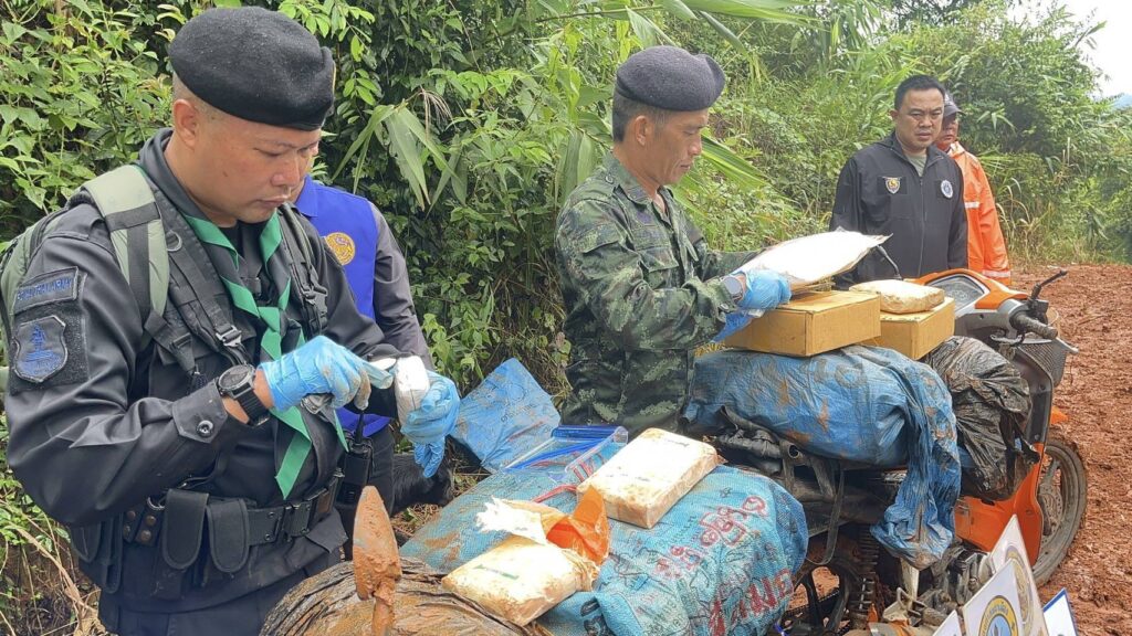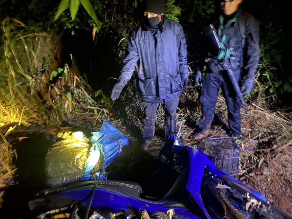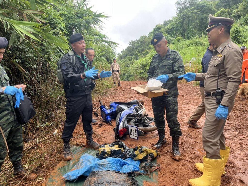 ต่อมาจนถึงรุ่งเช้าของวันที่ 27 ส.ค.68 เวลา 05.20 น. ทางเจ้าหน้าที่ได้ตรวจพบรถจักรยานยนต์ต้องสงสัย จำนวน 3 คัน บรรทุกสัมภาระ ขับขี่ตามกันมา ทางเจ้าหน้าที่ทหารพรานจึงได้ออกจากที่ซุ่มเพื่อแสดงตัวส่งสัญญาณทำการตรวจค้น แต่กลุ่มบุคคลดังกล่าว เมื่อเห็นเจ้าหน้าที่ได้ขับรถหลบหนี ไปทาง บ.อาดี่ ต.แม่ยาว อ.เมือง จ.เชียงราย จำนวน 1 คัน และ ได้ทิ้งรถจักรยานยนต์ จำนวน 2 คัน โดยอาศัยความมืดวิ่งหลบหนีเข้าป่าไปได้ จากการตรวจสอบ พบรถจักรยานยนต์ ยี่ห้อ ฮอนด้า รุ่นเวฟ 110 ไอ สีน้ำเงิน หมายเลขทะเบียน 2 กฆ 1105 เชียงราย จำนวน 1 คัน และ รถจักรยานยนต์ยี่ห้อ ฮอนด้า รุ่นเวฟ 110 ไอ สีส้ม – ดำ ไม่ติดแผ่นป้ายทะเบียน จำนวน 1 คัน พร้อมกระสอบฟาง จำนวน 6 กระสอบ ภายในแอบซุกซ่อนบรรจุยาเสพติดประเภท 1 (ยาบ้า) จำนวน 4 กระสอบ ๆละ 150,000 นับรวมได้ประมาณ 600,000 เม็ด และ อีก 2 กระสอบ กระสอบที่ 1 ภายในเป็นกล่องกระดาษ บรรจุยาเสพติดให้โทษประเภท 1 (เฮโรอีน) จำนวน 18 ถุง กระสอบที่ 2 บรรจุยาเสพติดให้โทษประเภท 1 (เฮโรอีน) จำนวน 2 ถุง รวมจำนวน 20 ถุง รวมน้ำหนัก 8.6 กก. เจ้าหน้าที่ทหารชุดตรวจยึดจึงได้นำของกลางทั้งหมดส่งพนักงานสอบสวน สภ.แม่จัน เพื่อดำเนินการตามกฎหมายต่อไป…