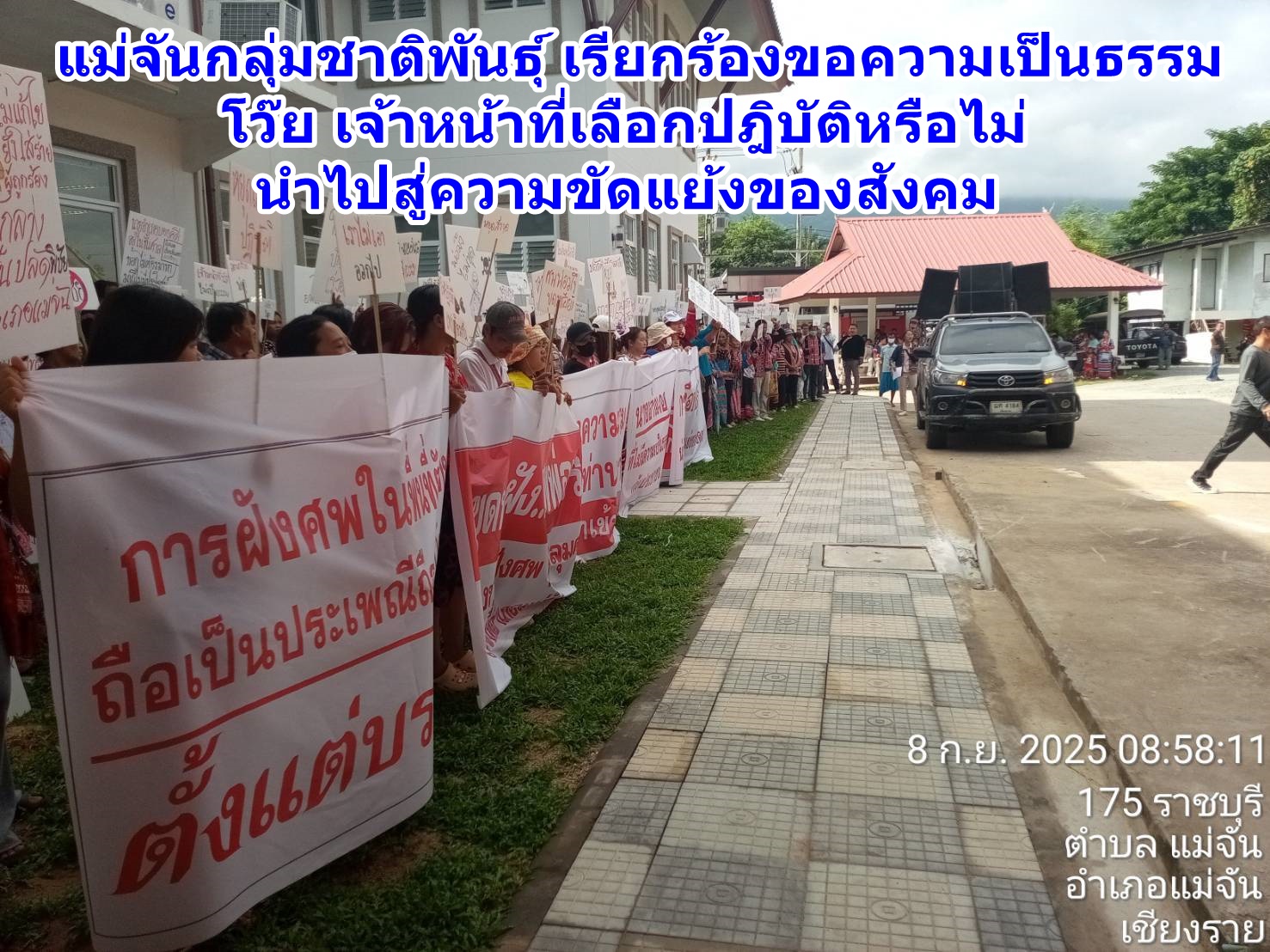 เมื่อช่วงเช้าวันนี้ ( 8 ก.ย.68 ) ณ ที่ว่าการ อ.แม่จัน จ.เชียงราย ได้มีประชาชนส่วนใหญ่เป็นกลุ่มชาติพันธุ์ลาหู่จากบ้านห้วยต่าง (จะพือ) หมู่ 16 ต.ป่าตึง อ.แม่จัน จำนวนหลายร้อยคนพากันออกมาชุมนุมเพื่อเรียกร้องขอความเป็นธรรม โว๊ย เจ้าหน้าที่เลือกปฎิบัติหรือไม่ นำไปสู่ความขัดแย้งของสังคม ณ หน้าที่ว่าการ อ.แม่จัน จ.เชียงราย โดยมีเจ้าหน้าที่ตำรวจ สภ.แม่จัน คอยดูแลรักษาความสงบเรียบร้อยให้กับผู้ชุมนุม กรณีผู้ชุมนุมเรียกร้องให้นายญาณวุฒิ สุดพิมศรี นายอำเภอแม่จัน แก้ไขปัญหาเรื่องการฝังศพพ่อเฒ่าในหมู่บ้านคือนายจะแก จิตเอื้ออังกูร อายุ 83 ปี ผู้เฒ่าผู้แก่ในหมู่บ้าน ซึ่งได้เสียชีวิตเพราะชราภาพเมื่อวันที่ 9 เม.ย.2567 และญาตินำไปฝังเอาไว้ในสถานที่ตามคำสั่งเสียของพ่อเฒ่าจะแก โดยชาวบ้านระบุว่าเป็นไปตามความเห็นชอบของซินแส ผู้นำทางจิตวิญญาณ ไม่กระทบกับหมู่บ้าน ต้นไม้ ลำธาร รวมทั้งไม่กระทบกับพิธีอื่นๆ ของหมู่บ้าน ห่างไกลชุมชน มีศพอื่นๆ ฝังในลักษณะเดียวกัน นอกจากนี้ยังมีลูกหลานและคนอื่นๆ ลงนามยินยอมกว่า 104 รายชื่อด้วย