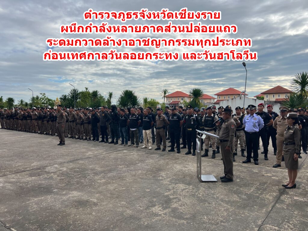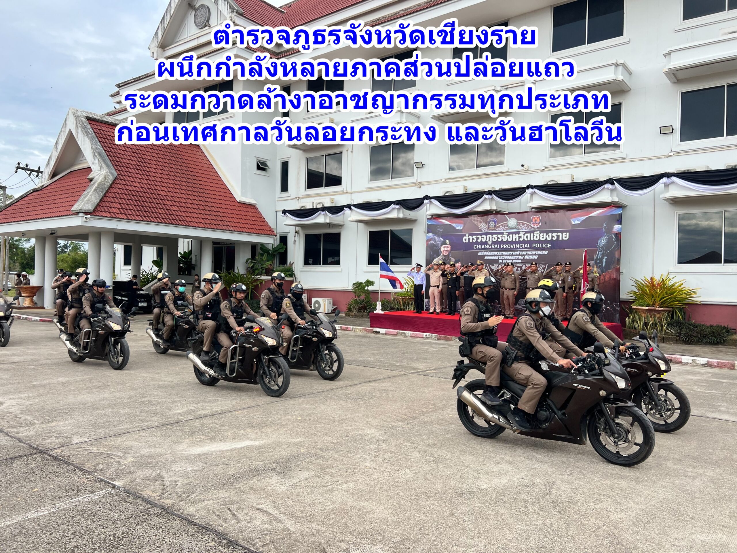 ตำรวจภูธรจังหวัดเชียงราย ผนึกกำลังหลายภาคส่วนปล่อยแถวระดมกวาดล้างาอาชญากรรมทุกประเภท ก่อนเทศกาลวันลอยกระทง และวันฮาโลวีน