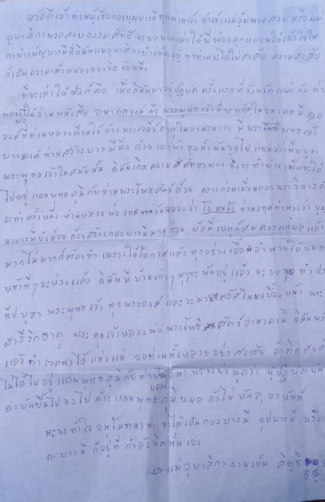 นอกจากนี้เจ้าหน้าที่ได้ตรวจสอบบนกุฏิที่พักพบจดหมายของแม่ชีสงบจำนวน 1 หน้ากระดาษเอ 4 โดยเขียนด้วยลายมือมีเนื้อหากล่าวถึงการปฏิบัติธรรมครั้งแรกที่ จ.แพร่ และได้เรียนรู้เกี่ยวกับพระพุทธเจ้าและอนาคามี 10 องค์ รวมทั้งข้างพระเจดีย์ธาตุในอาศรมเรามีพระโพธิสัตว์บางองค์ซึ่งจะเป็นพระพุทธเจ้าในภายภาคหน้าได้สร้างบารมีด้วยการเอาผ้าชุบน้ำมันแล้วจุดไฟเผาตัวแทนประทีปบูชาพระพุทธเจ้าในสมัยนั้น ดังนั้นตนจึงเกิดความศรัทธาและได้ทำบางเพื่อจะได้ไปอยู่ในแดนพุทธภูมิกับพระโพธิสัตว์ ก่อนหน้านี้หลวงพ่อเทศนาว่าอย่าได้ทำอย่างนั้นเพราะต้องสร้างบารมีก่อน กระทั่งปัจจุบันตนเห็นว่าสมควรและหมดความห่วงใยเพราะมีเพียงบ้านหลังเก่าๆ ผุุๆ จึงขอทำประทีปบูชาพระพุทธเจ้าทุกพระองค์รวมทั้งที่จะมาตรัสรู้ในเบื้องหน้า