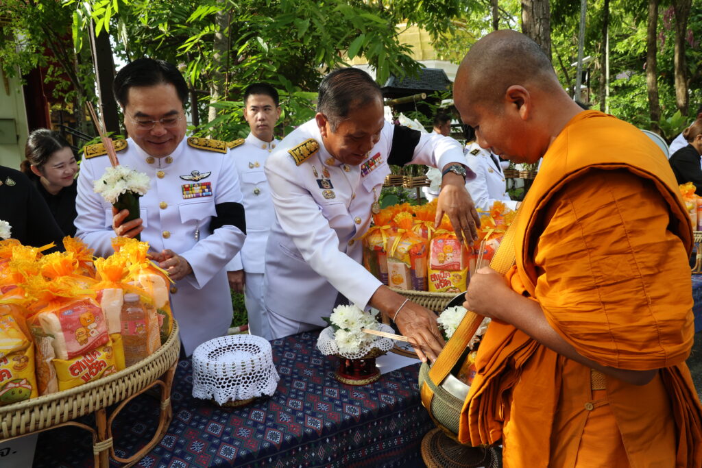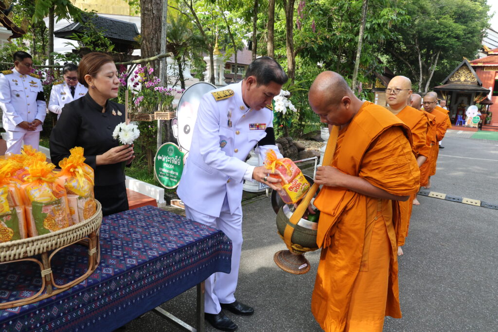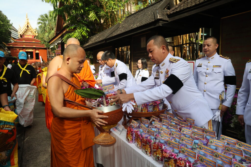 ภายหลังเสร็จสิ้นพิธีสงฆ์ นายรัฐพล นราดิศร ผู้ว่าราชการจังหวัดเชียงราย พร้อมด้วยนางวิยะดา นราดิศร นายกเหล่ากาชาดจังหวัดเชียงราย/ประธานแม่บ้านมหาดไทยจังหวัดเชียงราย นำคณะส่วนราชการ ผู้บริหาร ข้าราชการ บุคลากรในจังหวัดเชียงราย และประชาชนทั่วไปร่วมพิธีตักบาตรพระสงฆ์ จำนวน 93 รูป เพื่อถวายเป็นพระราชกุศลโดยพร้อมเพรียงกัน บรรยากาศเป็นไปด้วยความสงบ สำนึกในพระมหากรุณาธิคุณ และความจงรักภักดีอย่างล้นพ้น