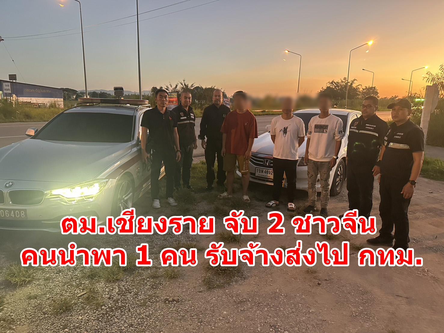 วันนี้ ( 12 พ.ย.68 ) เจ้าหน้าที่ด่านตรวจคนเข้าเมือง (ตม.) จว.เชียงราย สืบทราบว่าจะมีการลักลอบขนคนต่างด้าวโดยมีการใช้รถยนต์เก๋งสีขาวทะเบียนกรุงเทพฯ ผ่านพื้นที่ จ.เชียงราย จึงได้ออกตรวจตรากระทั่งช่วงเย็นวันเดียกวกันได้ตรวจพบรถเก๋งยี่ห้อ ฮอนด้า สีขาว ทะเบียนกรุงเทพฯ โดยมีนายชยุตพงศ์ อายุ 33 ปี ชาวแขวงดอนเมือง เขตดอนเมือง กรุงเทพฯ เป็นผู้ขับขี่ ไปตามถนนเส้นทางเลี่ยงเมืองหรือบายพาสฝั่งตะวันออกผ่าน ต.บ้านดู่ อ.เมืองเชียงราย เจ้าหน้่าชุดจับกุมจึงได้ให้สัญญาณให้จอดเพื่อตรวจสอบพบว่าภายในรถนอกจากจะมีนายชยุตพงศ์แล้วยังมีคนโดยสารมาด้วย 2 คน ชื่อว่า MR.JANG YI อายุ 40 ปี สัญชาติจีน และ MR.YI KAI อายุ 23 ปี ทั้งคู่เป็นชาวสัญชาติจีน เมื่อเจ้าหน้าที่ขอดูเอกสารการเข้าออกเมืองปรากฎว่าชาวจีนทั้งคู่ไม่มีให้และยังไม่สามารถพูดภาษาไทยได้อีกด้วย