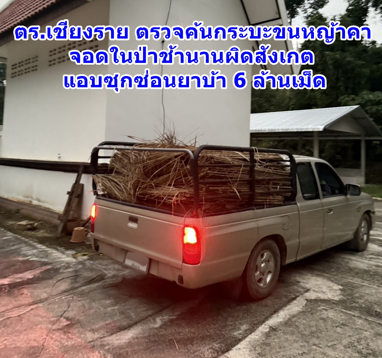 ตร.เชียงราย ตรวจค้นกระบะขนหญ้าคาจอดในป่าช้านานผิดสังเกต แอบซุกซ่อนยาบ้า 6 ล้านเม็ด