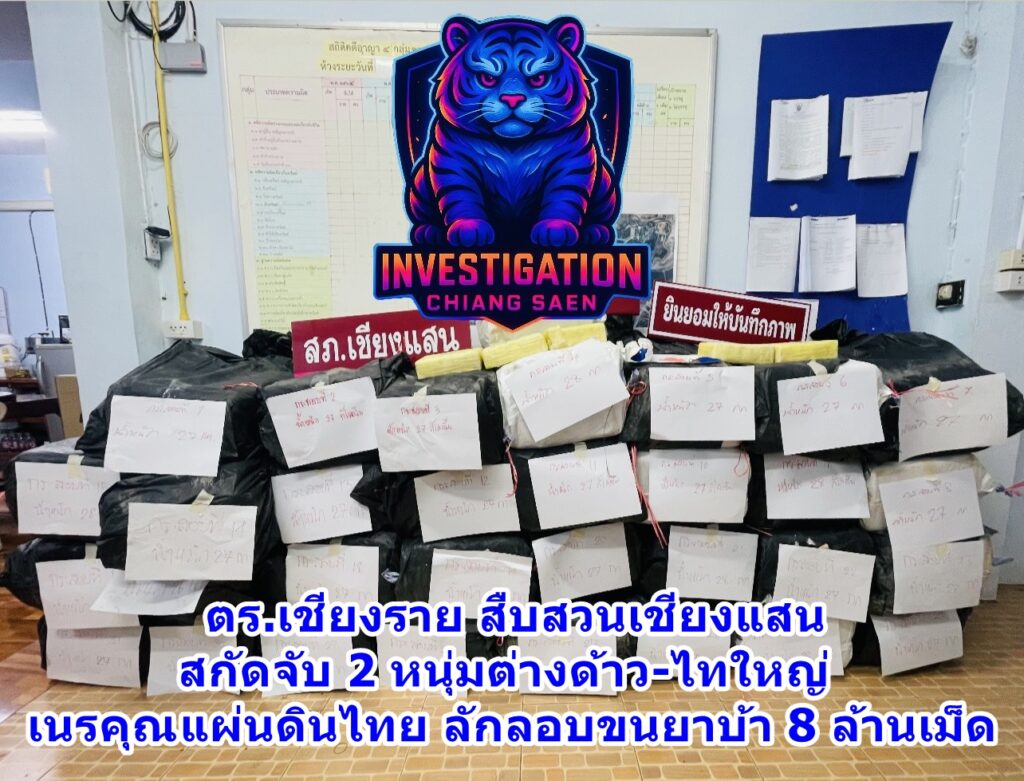 เจ้าหน้าที่อีกชุดหนึ่งจึงได้ตรวจค้นรถพบภายในเบาะนั่งบรรทุกกระสอบฟางหลากสีข้างในห่อหุ้มด้วยถุงพลาสติกสีดำอีกชั้นหนึ่ง จำนวน 32 ใบ เมื่อเปิดดูภายในพบบรรจุยาเสพติดประเภทยาบ้ากระสอบละประมาณ 250,000 เม็ด รวมยาบ้าทั้งหมด 8,110,000 เม็ด จึงได้จับกุมตัวนายชัยเอาไว้ กระทั่งต่อมาเวลาประมาณ 01.40 น.วันที่ 28 พ.ย.2568 เจ้าหน้าที่ตำรวจก็สามารถนายแสงตุ้ยเอาไว้ได้อีกคน จึงนำตัวทั้ง 2 คน พร้อมของกลางส่ง ร.ต.อ.มงคล สุเตนันท์ รอง สว.(สอบสวน) สภ.เชียงแสน เพื่อดำเนินคดีและขยาสยผลตามกฎหมาย เบื้องต้นหนึ่งในผู้ต้องหาให้การรับสารภาพว่าได้รับการติดต่อจากนายหองชายชาวเมียนมาให้ไปรับรถยนต์ของกลางที่สถานีเติมน้ำมันเชื้อเพลิงหรือปั๊มน้ำมันบางจาก หมู่บ้านกู่เต้า หมู่ 3 ต.โยนก อ.เชียงแสน จากนั้นได้ขับรถยนต์เพื่อไปขนกระสอบฟางที่ซุกซ่อนยาเสพติด บริเวณหมู่บ้านวังลาว หมู่ 4 ต.เวียง อ.เชียงแสน จนมาถูกเจ้าหน้าที่สกัดจับได้พร้อมยาบ้าของกลาง 8,110,000 เม็ด