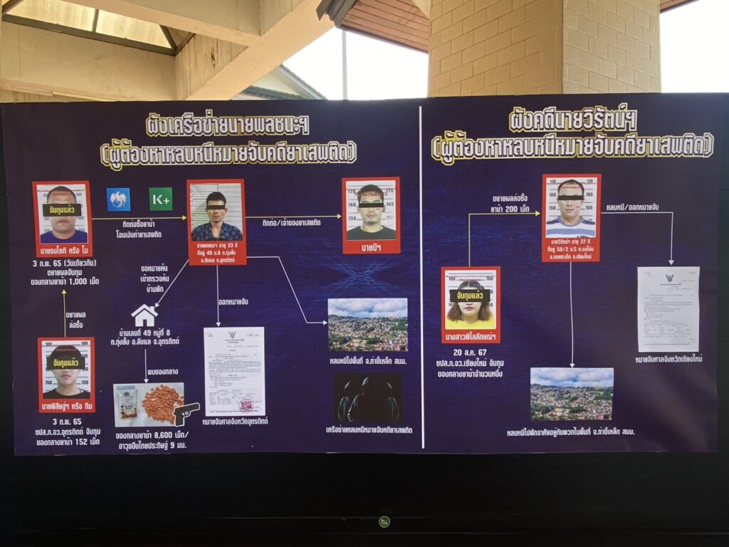 ทราบชื่อดังนี้ 1.นายวิรัตน์ ท้าวอุดม อายุ 37 ปี สัญชาติไทย อ.ดอยสะเก็ด จ.เชียงใหม่ ผู้ต้องหาตามหมายจับศาลจังหวัดเชียงใหม่ ในความผิดฐาน“จำหน่ายยาเสพติดให้โทษในประเภท 1 (ยาบ้าหรือเมทแอมเฟตามีน) โดยมีไว้เพื่อจำหน่าย อันเป็นการกระทำเพื่อการค้า และเป็นการก่อให้เกิดการแพร่กระจายในกลุ่มของประชาชนโดยไม่ได้รับอนุญาต”นำส่ง สภ.แม่โป่ง