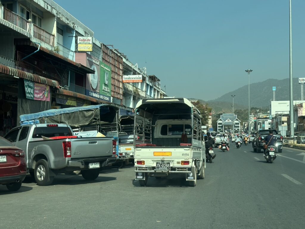 เมืองชายแดนแม่สายเชียงราย ปัญหาการจราจรติดขัด ย่านบริเวณตั้งแต่แยกไฟแดงกวงเม้ง หน้าตลาดนายบุญยืน จรดถึงบริเวณด่านพรมแดนแม่สายแห่งที่ 1 ปัญหารถติดทวีความรุนแรงขึ้นอย่างต่อเนื่อง หลังกลุ่มรถสกายแลปสามล้อแดงเมียนมาจอดแช่รอลูกค้าของใครของมัน ที่จะรับผู้โดยสารข้ามไปฝั่งเมียนมา ทำให้การจราจรเมืองติดขัด กีดขวางทางเข้าออกร้านค้า และสถานประกอบการสูญเสียรายได้เพราะลูกค้าไม่สามารถจอดรถได้ ในการลงไปชื้อสินค้าของผู้ประกอบการ และไม่สามารถสัญจรได้ตามปกติ ร่วมไปถึงความปลอดภัยบนท้องถนน สร้างปัญหาเรื้อรังมานานหลายปี แม้จะมีการร้องเรียนซ้ำแล้วซ้ำเล่า เมื่อเจ้าหน้าที่ลงตรวจ รถก็ขยับ พอเจ้าหน้าที่กลับ ก็ขับวนมาบริเวณที่มันว่างใหม่อีกครั้ง ถามว่าจะให้เจ้าหน้าที่มาเฝ้าปัญหาพวกนี้ทั้งวันก็เป็นไปไม่ได้