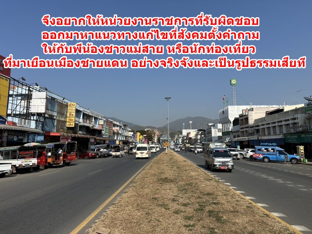 ปัญหาเหล่านี้จึงถูกตั้งคำถามขึ้นว่า รถสกายแลปสามล้อแดง รถตู้รับจ้างขนสินค้าเมียนมา เหล่านี้ที่สามารถขับขี่สัญจรรับจ้างบนท้องถนนทั่วทั้งอำเภอแม่สาย มีกี่คัน และมีสิทธิ์รับจ้าง-ส่งผู้โดยสารไปตามชุมชนต่างๆ ได้หรือไม่ โดยที่ผ่านมาได้เกิดปัญหาแย่งลูกค้ากับคิวรถสองแถว หรือวินมอเตอร์ไซค์ ของฝั่งไทยมาโดยตลอด จึงอยากให้หน่วยงานราชการที่รับผิดชอบออกมาหาแนวทางแก้ไขที่สังคมตั้งคำถาม ให้กับพีน้องชาวแม่สาย – หรือนักท่องเที่ยวที่มาเยือนเมืองชายแดน อย่างจริงจังและเป็นรูปธรรมเสียที….