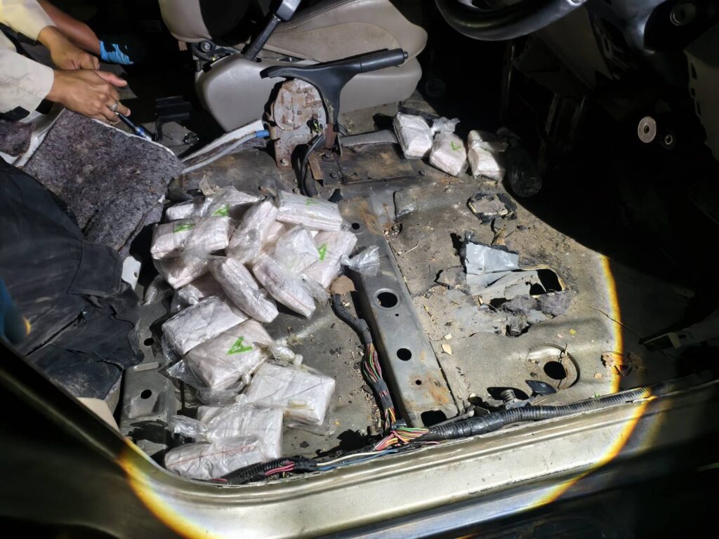 กระทั่งเวลาประมาณ 21.20 นาที ของวันเดียวกันเมื่อเจ้าหน้าที่ตรวจตราไปถึงบริเวณ ฌาปนสถาน หมู่บ้านท่าข้าม ได้ตรวจพบรถยนต์ต้องสงสัยคันดังกล่าวจอดอยู่ภายในป่าช้า ท่าทางต้องสงสัยเพราะเป็นช่วงเวลากลางดึกแล้ว จึงไม่น่าจะมีพิธีกรรมหรือผู้คนเข้าไปบริเวณดังกล่าว เจ้าหน้าที่จึงตรวจสอบโดยรอบไม่พบบุคคลแสดงตัวเป็นเจ้าของจึงได้ตรวจสอบภายในรถปรากฎว่าพบที่เบาะหลังคนขับพบบรรทุกกระสอบฟางสีขาวมาจำนวน 1 กระสอบ เมื่อเปิดดูภายในกระสอบพบซุกซ่อนบรรจุยาเสพติดให้โทษประเภท 1 (ยาบ้า) จำนวน 82,000 เม็ด