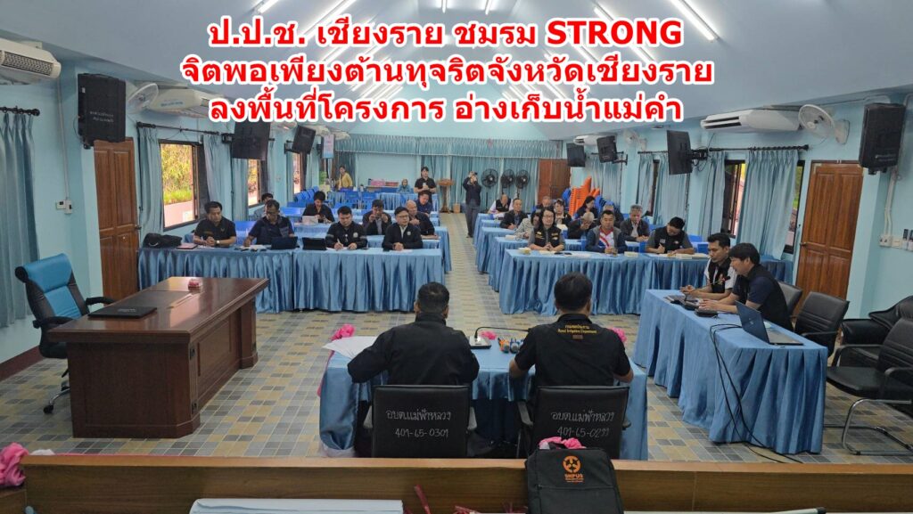 วันที่ 25 กุมภาพันธ์ 2569 ณ ห้องประชุม อบต.แม่ฟ้าหลวง อ.แม่ฟ้าหลวง จ.เชียงราย นายสนธยา ยาพิณ ผู้อํานวยการสํานักงาน ป.ป.ช.ประจําจังหวัดเชียงราย มอบหมายให้เจ้าหน้าที่กลุ่มงานป้องกันการทุจริต สำนักงาน ป.ป.ช. ประจำจังหวัดเชียงราย นำโดย นายนั้ง แสงเพชรไพบูรณ์ หัวหน้ากลุ่มงานป้องกันการทุจริต ลงพื้นที่ร่วมกับคณะกรรมการชมรม STRONG – จิตพอเพียงต้านทุจริตจังหวัดเชียงราย นำโดยนางวันดี ราชชมภู ประธานชมรม STRONGฯลงพื้นที่จับตามองและแจ้งเบาะแส โครงการอ่างเก็บน้ำแม่คำ หมู่ที่ 13 บ้านสามัคคีใหม่ ต.แม่ฟ้าหลวงอ.แม่จัน งบประมาณดำเนินการ มากกว่า 100,000,000 บาท (หนึ่งร้อยล้านบาท) ก่อนจะลงตรวจสอบโครงการดังกล่าว ได้มีการประชุมชี้แจงความเป็นมาและวัตถุประสงค์ของการลงพื้นที่ติดตาม/เฝ้าระวังการทุจริต โดยนายนั้ง แสงเพชรไพบูรณ์ หัวหน้ากลุ่มงานป้องกันการทุจริต ป.ป.ช.ประจำจังหวัดเชียงราย