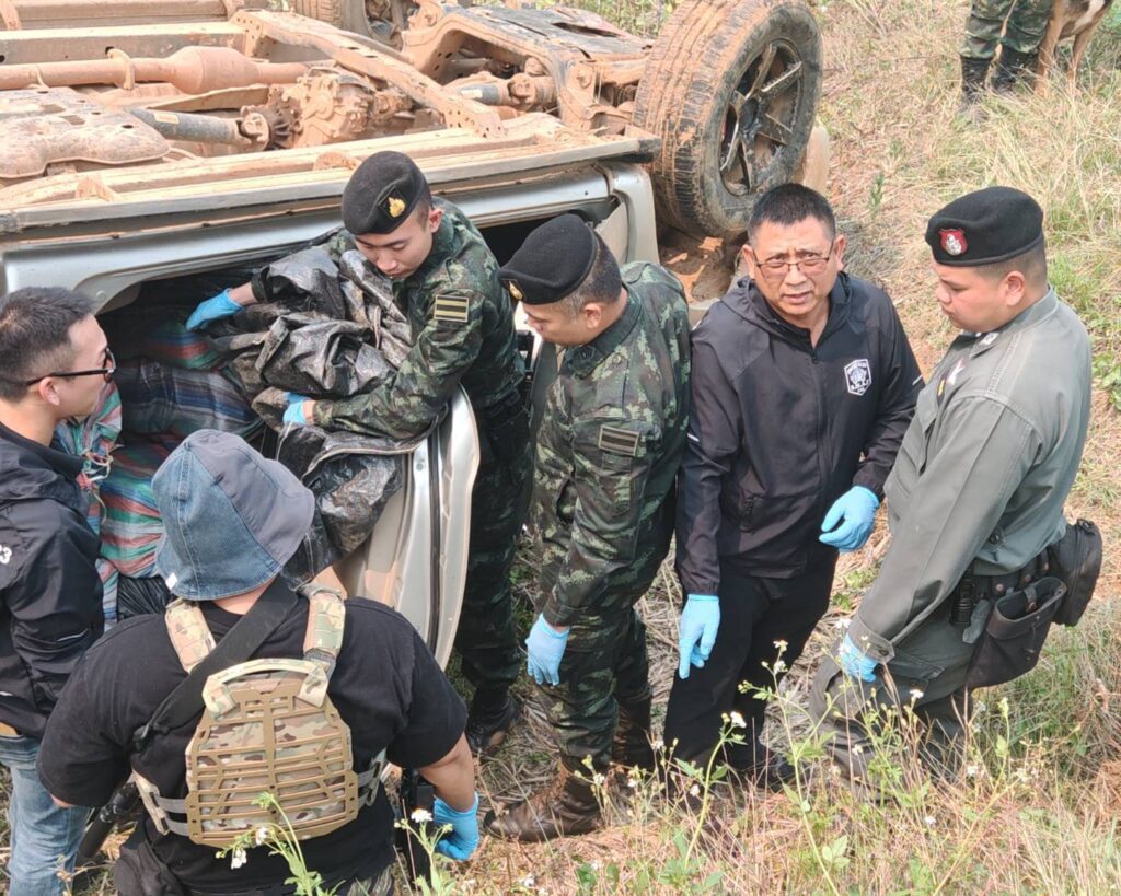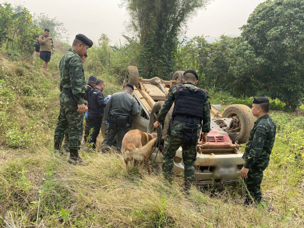 ต่อมาเวลา 07.30 น.วันเดียวกันเจ้าหน้าที่ได้ตรวจพบรถยนต์กระบะต้องสงสัย เป็นยี่ห้อโตโยต้า รุ่นไฮลักวีโก้ สีบรอนซ์ ป้ายทะเบียน จ.เชียงราย จำนวน 1 คัน ขับลงเขามาด้วยความเร็วผิดปกติ เจ้าหน้าที่จึงแสดงตัวเพื่อจะขอทำการตรวจค้น แต่รถคันดังกล่าวได้เร่งความเร็วขับฝ่าจุดตรวจไปเพื่อหลบหนี ทำให้เจ้าหน้าที่ได้นำยานพาหนะออกไล่ติดตามไปอย่างกระชัดชิด และยังไม่ทันจะขับหลบหนีออกจากพื้นที่หมู่บ้าน จนรถยนต์กระบะคันดังกล่าวได้หักหลบเสียหลักพลิกคว่ำหงายเอาส่วนล้อขึ้นฟ้า ลงไปยังข้างทางซึ่งเป็นพื้นที่ทางการเกษตร แต่คนขับรถคนดังกล่าว ได้เปิดประตูรถออกมาได้ ก่อนจะชักอาวุธปืนไม่ทราบขนาดยิงใส่เจ้าหน้าที่จำนวน 6 นัด เพื่อเปิดทางก่อนอาศัยความชำนาญหลบหนีเข้าไปในป่าได้ ซึ่งกระสุนไม่ถูกเจ้าหน้าที่ทำให้ทุกนายปลอดภัย